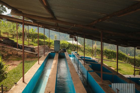 - As with most washing stations in Rwanda, women do the majority of hand-sorting. This takes place in two stages – on the covered pre-drying tables and on the drying tables. Washed beans are moved from the wet fermentation tanks onto the pre-drying tables, where they are intensively ‘wet sorted’ under shade for four hours. The idea is that greens (unripe beans) are still visible when the beans are damp, while the roofs over the tables protect the beans from the direct sunlight.