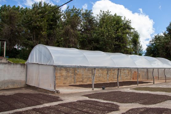 The freshly picked coffee cherries were washed and then placed to dry slowly in greenhouse conditions on raised beds at the front of Aneilson’s home. Coffee was laid in very thin layers of about four centimetres and raked about six times a day. Once the coffee reached its optimal moisture content, it was separated into numbered lots and dry milled at the nearby Fazenda Machado, which belongs to Mr. Agnon Araujo, a friend of Aneilson’s. It was then stored and rested at one of Fazenda Progresso‘s purpose-built warehouses, where it was prepared for export.