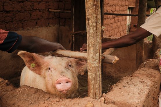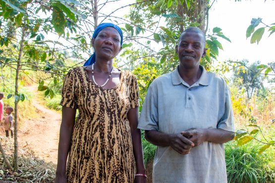 With the income generated from coffee, Victoria and Theobald have made improvements to their home, where they live with their three children. The eldest, Diane, is a university student who lends a hand during her holidays, while the younger siblings (a pair of twins, Delphine and her brother) are finishing their secondary studies. Victoria’s goal this year is to plant another 150 trees, to gift to her daughters. She hopes they then become cooperative members themselves, as part of Dukunde Kawa’s youth programs. Farming is already a family affair, to Theobald’s delight, who shared with us in 2024 that he feels “really proud for my family because they are willing to join me in my activities. They are very good workers. We meet together in our purpose.” At the property, the family have planted crops like soghurm, yams, bananas and papaya, and raise rabbits and pigs alongside their cow. The crops held add mulch and shading to the farm, and the produce is either consumed or sold for profit at the local market.